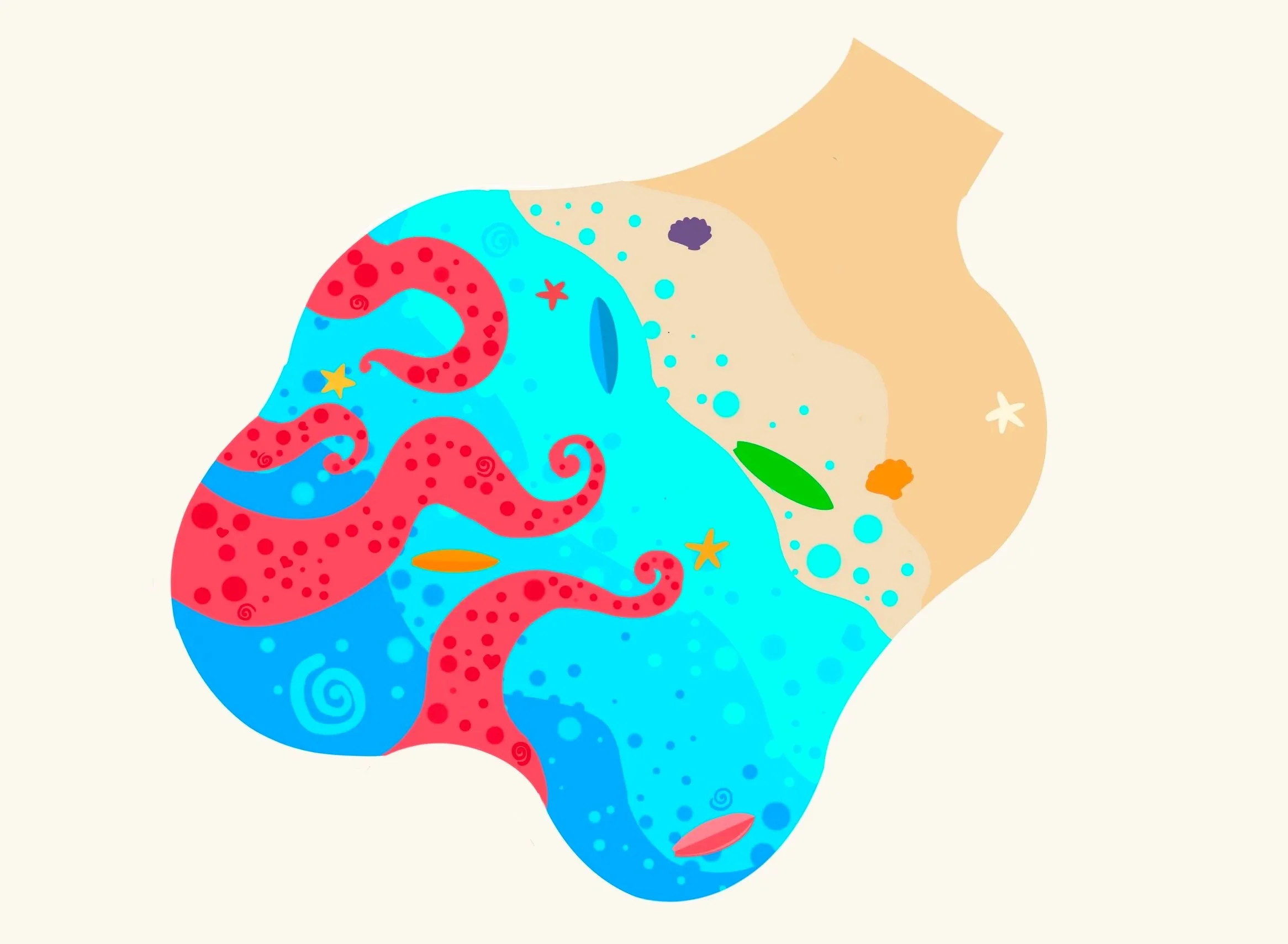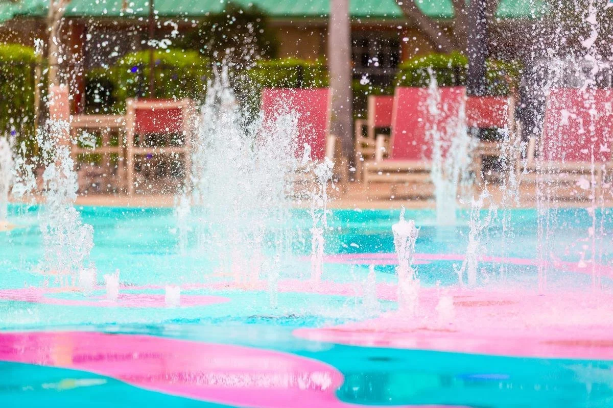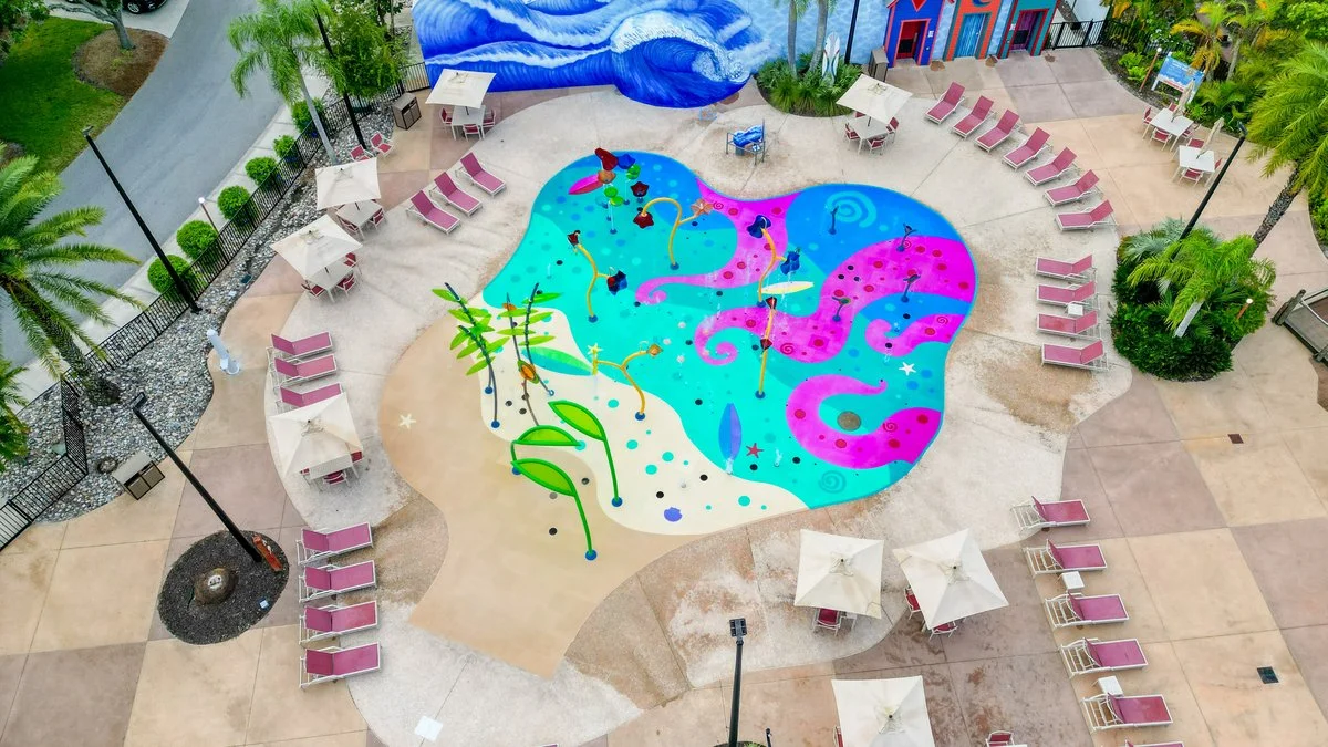 When our internal review panel received the application, it was a unanimous vote for acceptance. Shortly after we delivered the good news, our in-house Design Studio met with the Give Kids The World’s project team to discuss options. Their team presented a lovely sketch of their dream for the amenity. It showed a highly thematic design that referenced the splash pad's mascot, an octopus named Jack, with swirling pink tentacles that lead visitors through the different spray features as guided pathways. Life-sized surfboards integrated into the surface are placed throughout for playful activation, and Marine Inlays are interspersed for additional engagement.